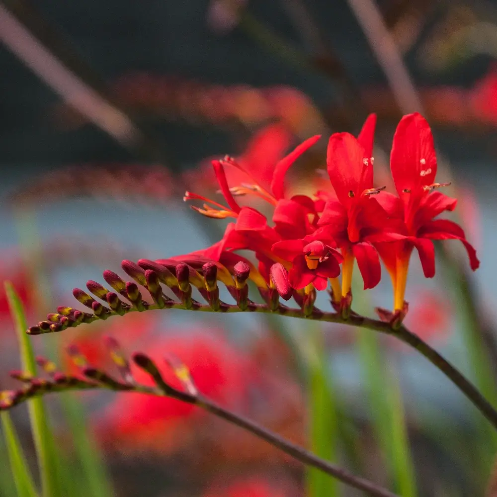 Striking, arching red flowers in late summer above swathe of sword-shaped foliage