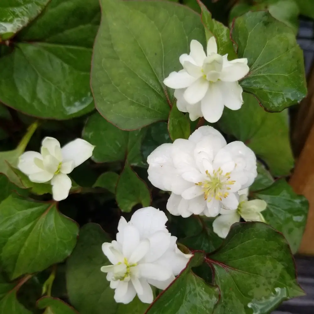 Hardy perennial with dense, lush foliage flushed with red margins and pretty white flowers in summer