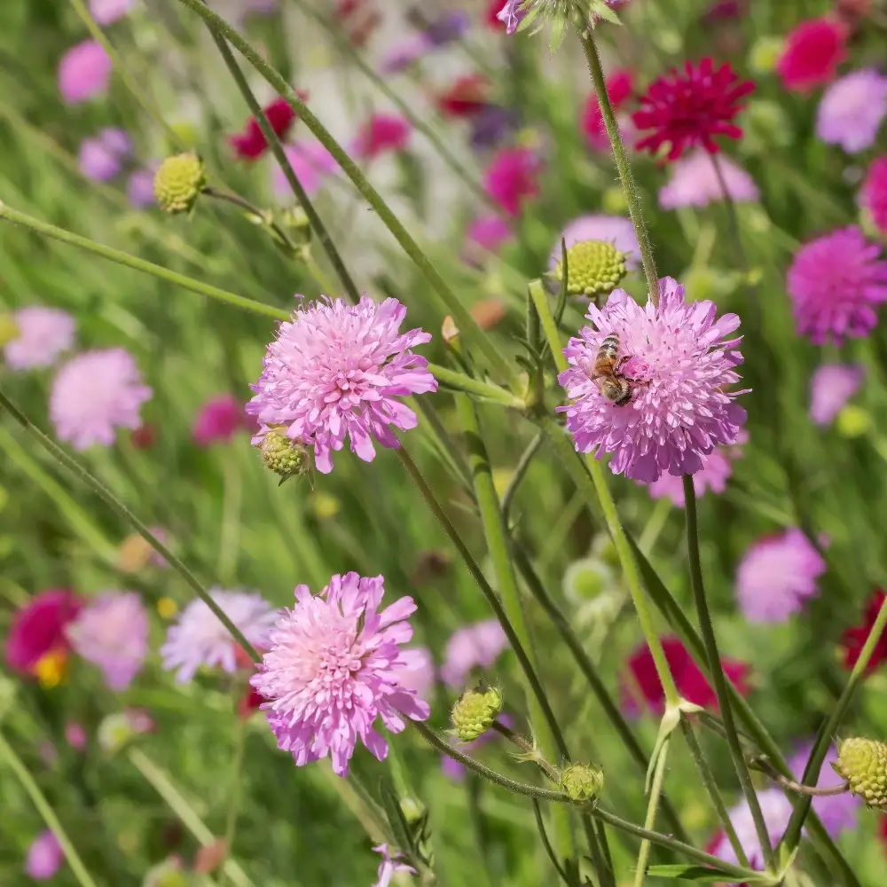 Hardy perennial with pops of soft, pastel-lilac coloured, pincushion flowers in summer