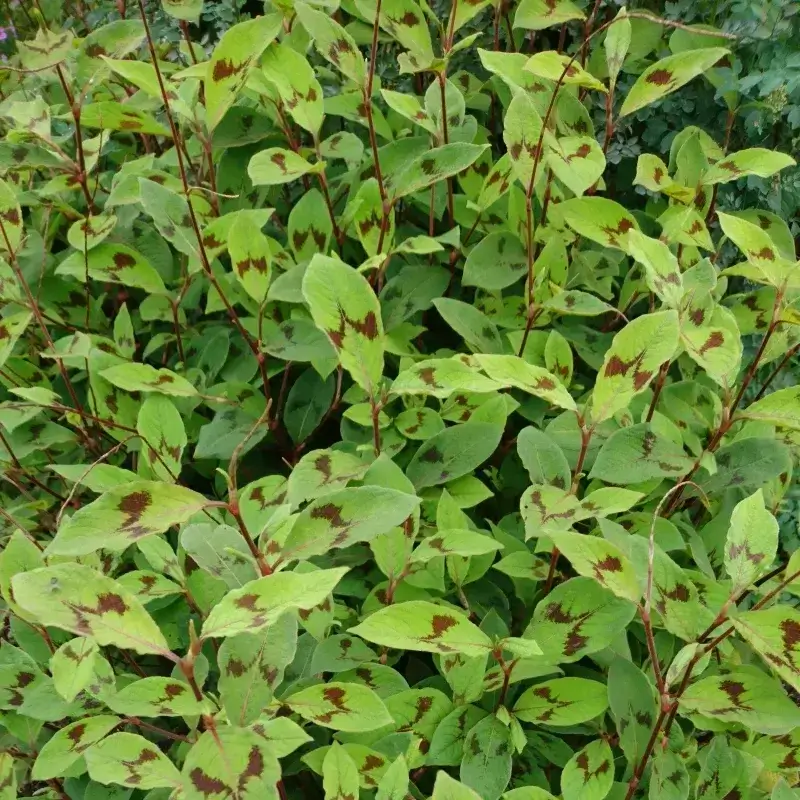 Handsome, strongly patterned foliage plant with spikes of deep-red flowers in late summer