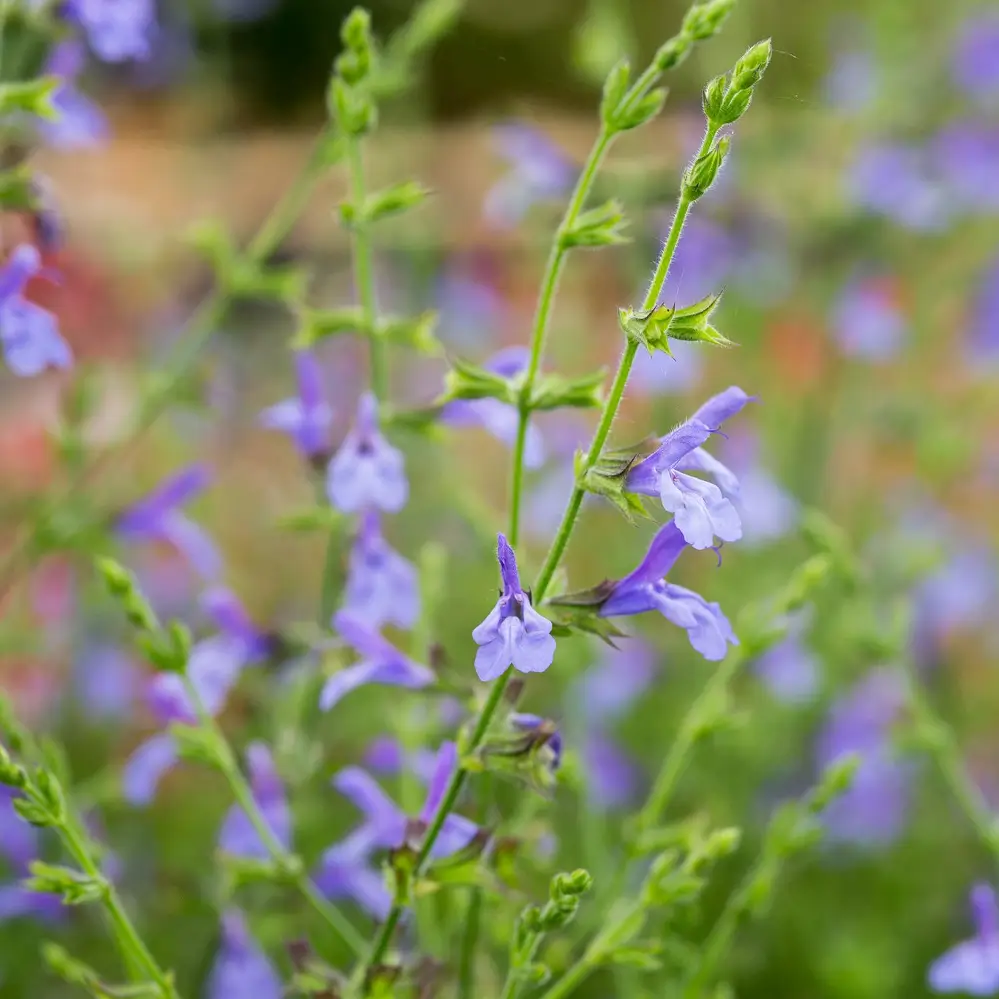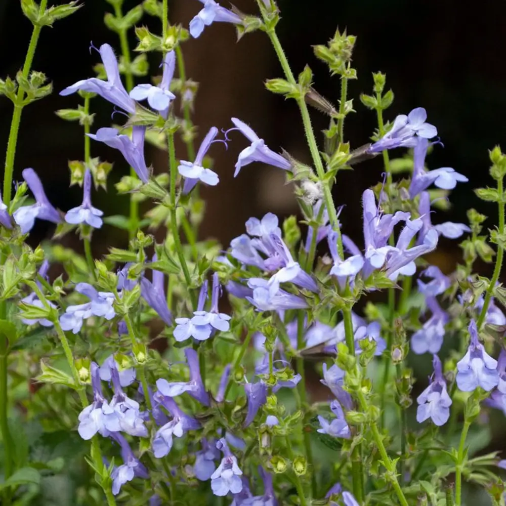 Compact, floriflerous Salvia with masses of sky-blue flowers through summer